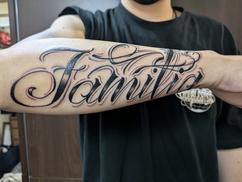 まず初めに肘にスペイン語でレタリングを配してみました、これから色々展開していきます。
